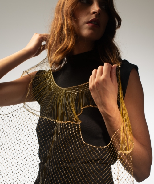 Since 2017, Cécile Gray has been developing a unique technique of metal meshwork, honing her own artisanal expertise at the intersection of wearing, embroidery and jewelry. This exceptional material, with its variations, is the result of the meticulous manual setting of thousands of golden beads. While retaining the structural approach and voluminous style from her background in architecture, Cécile gray infuses her work with the sensitivity and poetry of handcraft. Winner of the International Festival of Hyères (Audience Award – Accessory category) and the Elle-LVMH Craftswomen’s Award in 2022, she now collaborates with prestigious houses such as Hermès, Ruinart and Piaget.