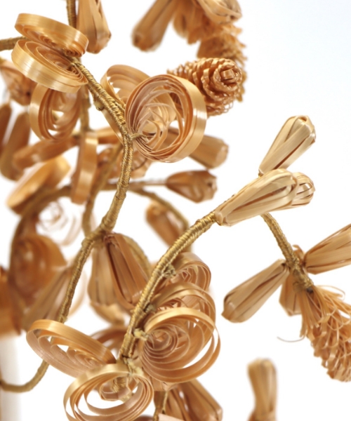 The nature of straw allows for a wide variety techniques. Straw can be plaited, woven, embroidered and combined with other materials. Straw strips are also glued to thin backings and various shapes are punched or cut from them.