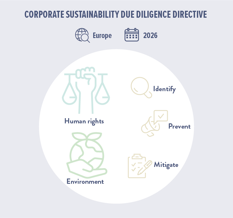 The directive covers potential violations of human rights (freedom of thought and religion, labour rights including the prohibition of forced labour, child labour, freedom of association and collective bargaining, etc.) and environmental rights (violations of the objectives and prohibitions of international environmental conventions). The CSDDD thus implies to:- integrate the due diligence duty into company policies (code of conduct, implementation and management of a complaints procedure and whistle-blowing systems);